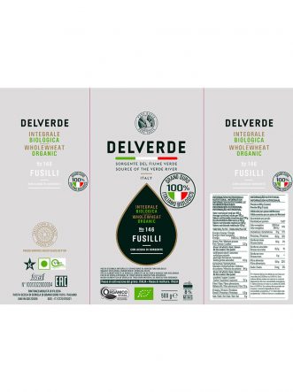 Delverde Wholewheat Organic Fusilli is pasta with wholemeal durum wheat semolina from 100% Italian organic farming, produced with pure spring water. Bronze drawing and slow drying at low temperatures, all the nutritional richness of the grain of wheat, including fibre, vitamins and minerals, are maintained with the safety of organic without sacrificing the delicious taste. Fusilli has excellent cooking yield and offers the perfect consistency and bite. Ideal for light sauces served with fish or vegetables.