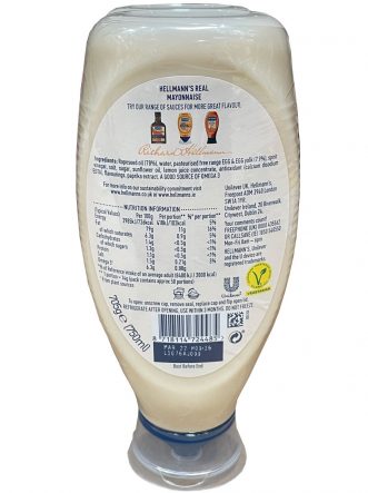 Hellmann’s Real Squeezy Mayonnaise offers the unmistakable taste of Hellmann’s to bring out the best of your sandwich, burger or salad. Over 100 years ago, Richard Hellmann created Hellmann’s in a deli in New York. He marked his best products by tying a blue ribbon around them. This blue ribbon is still found on the label and signifies the ongoing commitment to great quality products. Today, Hellmann’s mayonnaise continues to be made using quality ingredients like free range eggs and sustainably sourced oils. Hellmann’s Real Mayonnaise is a good natural source of Omega 3 and is suitable for vegetarians.